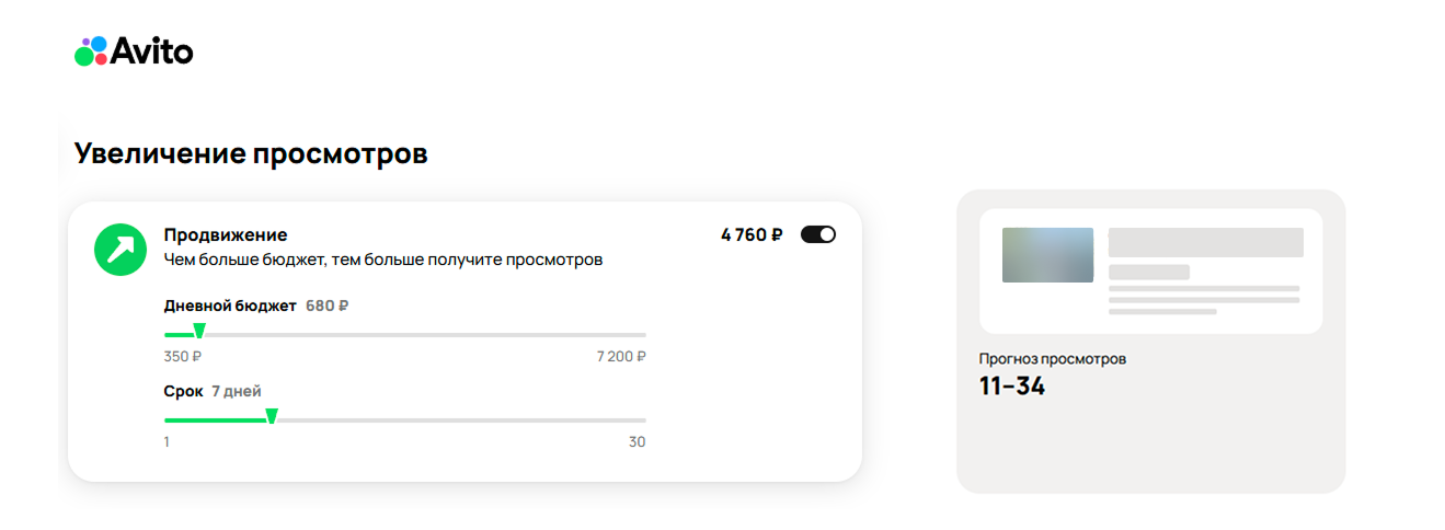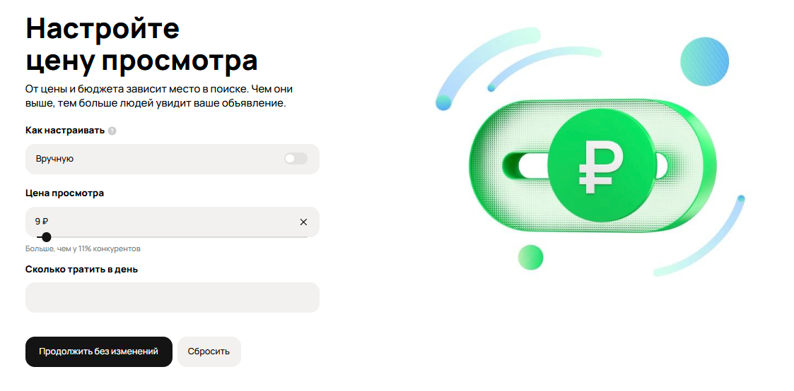 - либо доверить оптимизацию Авито — система сама будет корректировать цену так, чтобы в рамках бюджета получать максимум показов.