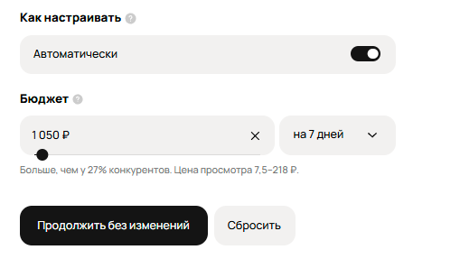 Либо выбрать автоматическую стратегию: в этом случае система сама определяет оптимальную цену, чтобы объявление получало максимум просмотров в рамках заданного бюджета.